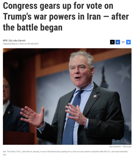 △好意思国国度大众播送电台报说念,本周,国会将对旨在法例特朗普在伊朗军事举止的干戈权益决议进行投票。