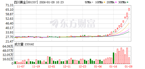 四川黄金再度涨停,10个交易日内录得7个涨停,累计涨幅为112.32%,累计换手率为149.77%。截至9:51,该股今日成交量2258.55万股,成交金额14.82亿元,换手率7.83%。最新A股总市值达280.81亿元,A股流通市值192.86亿元。