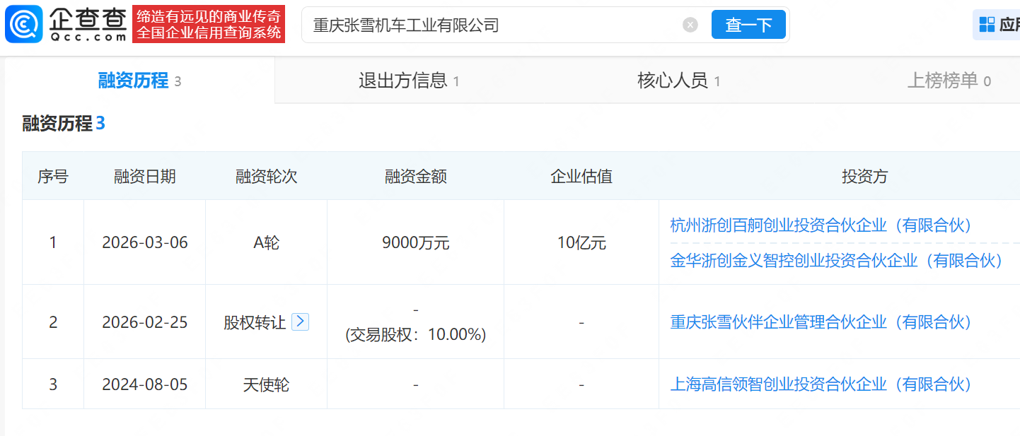 2026年3月初,张雪机车完成A轮融资,投后估值约10.9亿元,本轮投资方金华浙创金义智控创业投资合股企业(有限合股)背后,宏昌科技(301008)出资29.82%。