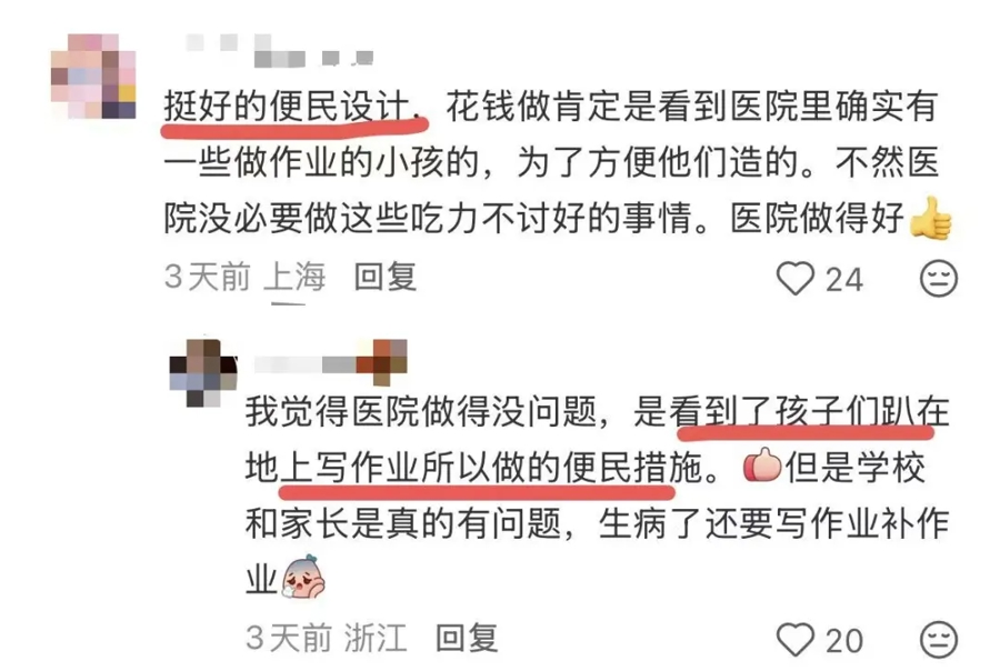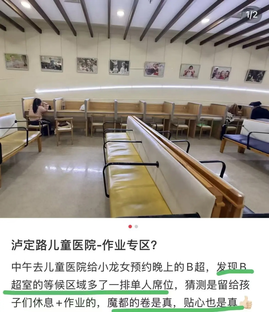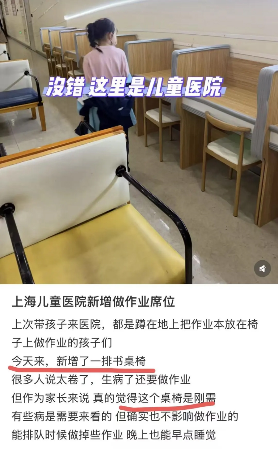 近日,上海儿童病院门诊大厅一瞥新鲜的书桌椅,被带娃来看病的家长发到外交平台,偶而激发了一场全民大盘考:是“卷”一经“贴心”?