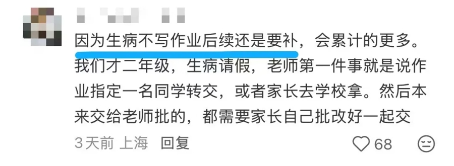 一位网友谈出无奈:咱们才二年事,生病请假,憨厚第一件事便是让同学转交功课。不写的话,且归堆得更多。