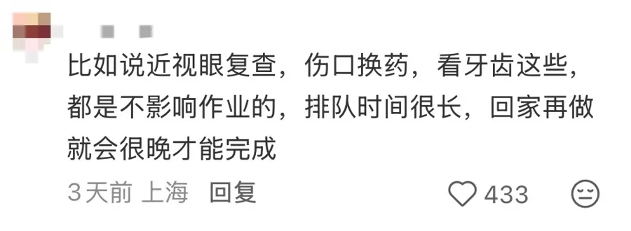 另一位网友momo例如,其实像是近视复查、换药、看牙齿,这些列队时代长,又皆不影响作念功课。等回家再作念,孩子得熬到几点?