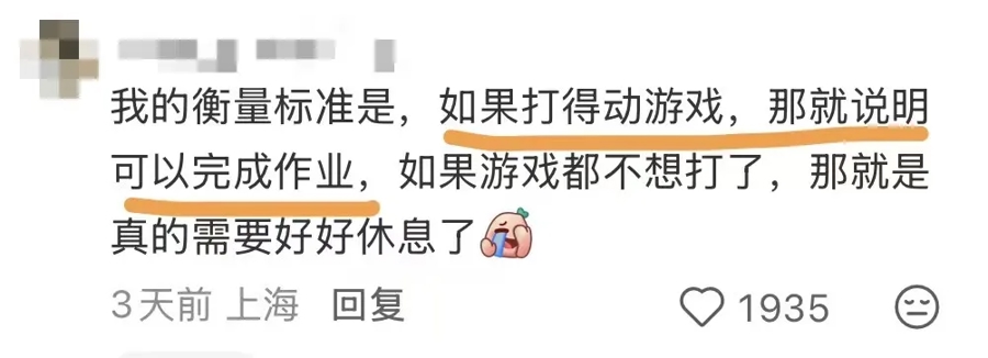 还有一位网友的不雅点,不仅被帖主点赞,也赢得1900多个赞:他说:我的算计步骤是,若是打得动游戏,那就评释不错完生效课;若是游戏皆不思打了,那便是真实需要好好休息。你是否也赞同呢?