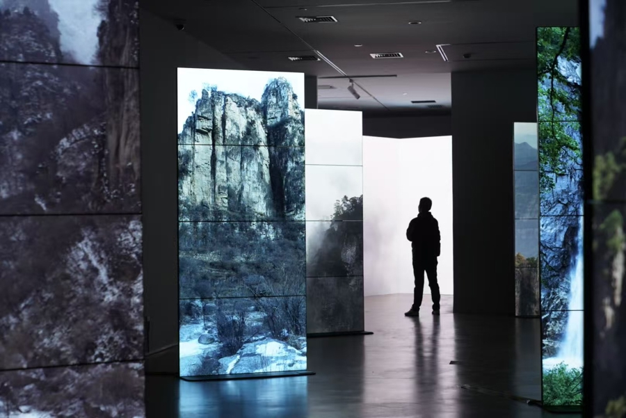 现场展出了由中国好意思术学院跨媒体艺术学院副院长、西席高世强指导的山水影像创作集体自2017年执续于今的以山水影像为主的轮廓艺术巨构。