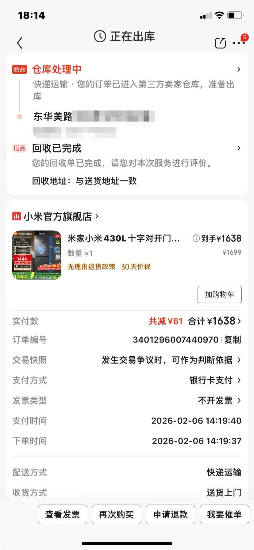 据吴女士先容,母亲家中的西门子雪柜使用年限过长,制冷后果大不如前。恰逢国度推出了家电以旧换新补贴计谋,她缠绵在春节前为母亲完成雪柜的升级换代。2月6日,她在一家电商平台的小米官方旗舰店,下单了小米430L十字对开门雪柜,享受补贴后实付价1638元。“按有关进程,平台会派东谈主先上门回收旧雪柜,再送新品。”但等了几天,也不见有东谈主主动关联,吴女士究诘平台客服,对方以“左近春节东谈主手垂死”为由,漠视推迟到春节后再上门回收。