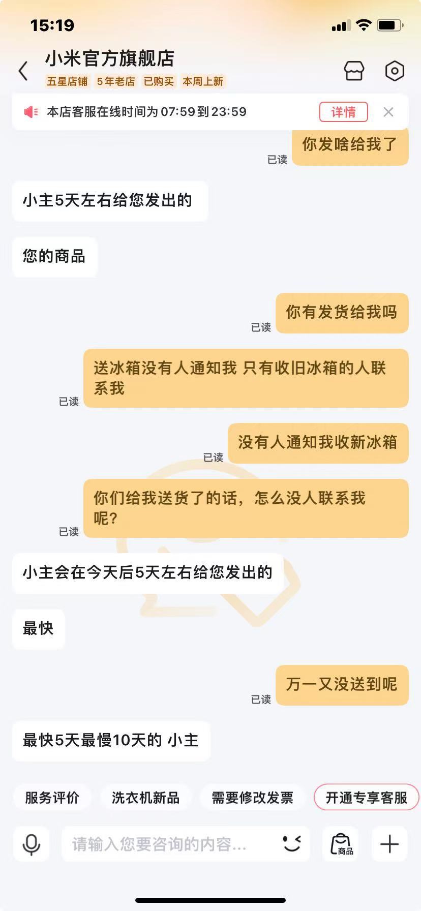 盛康优配本念念给母亲家换台新雪柜,没念念到被商家放鸽子坑惨了!”近日,市民吴女士向“新民帮侬忙”响应,她在电商平台小米官方旗舰店购买小米雪柜,却遇到连环“背约”:先是旧雪柜回收宽限,再是新雪柜“暂时缺货”迟迟不投递,老东谈主一度因此堕入无雪柜可用的境地,家中生鲜多数变质,日常活命大受影响。